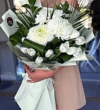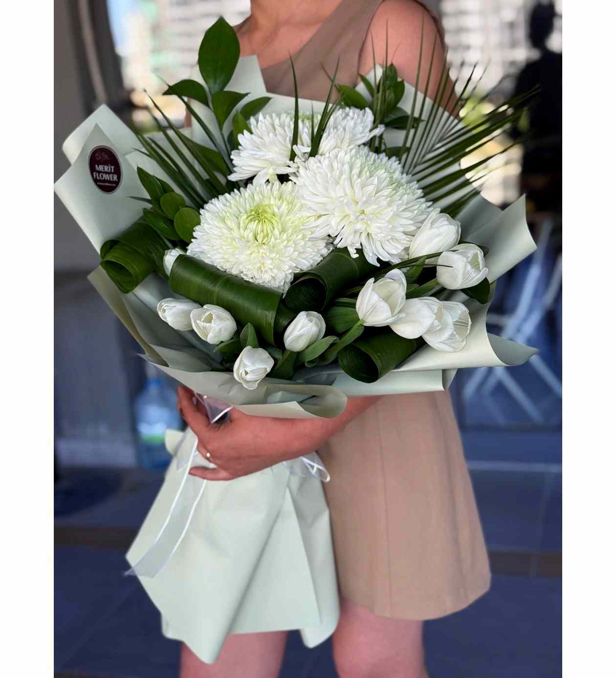 Beyaz tonlardaki çiçekler ve doğal yeşil dokunuşlar, bukete ferah ve modern bir görünüm kazandırır. Özenle hazırlanan sade paketleme, çiçeklerin zarafetini ön plana çıkarır.
