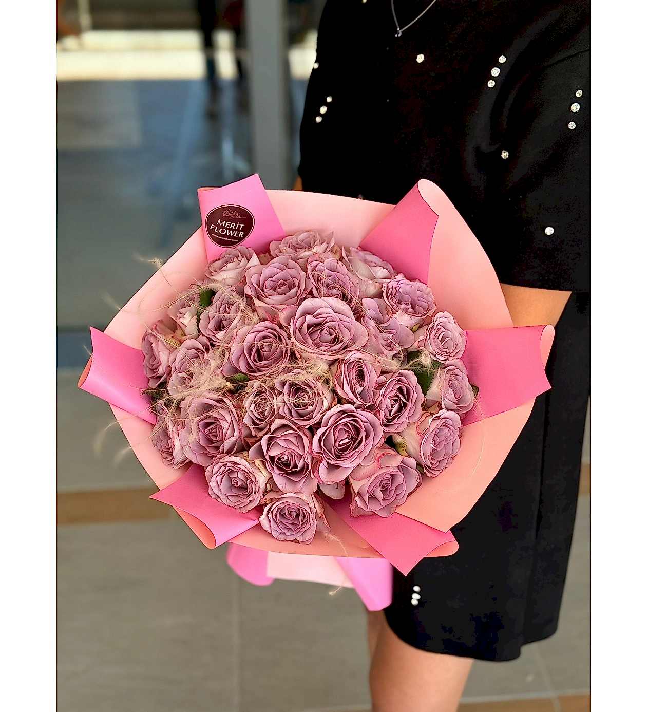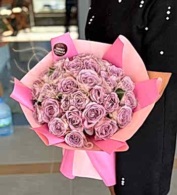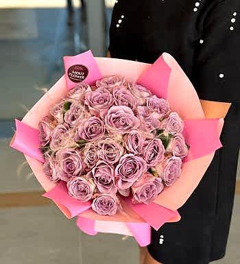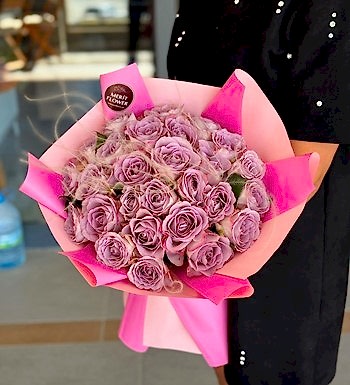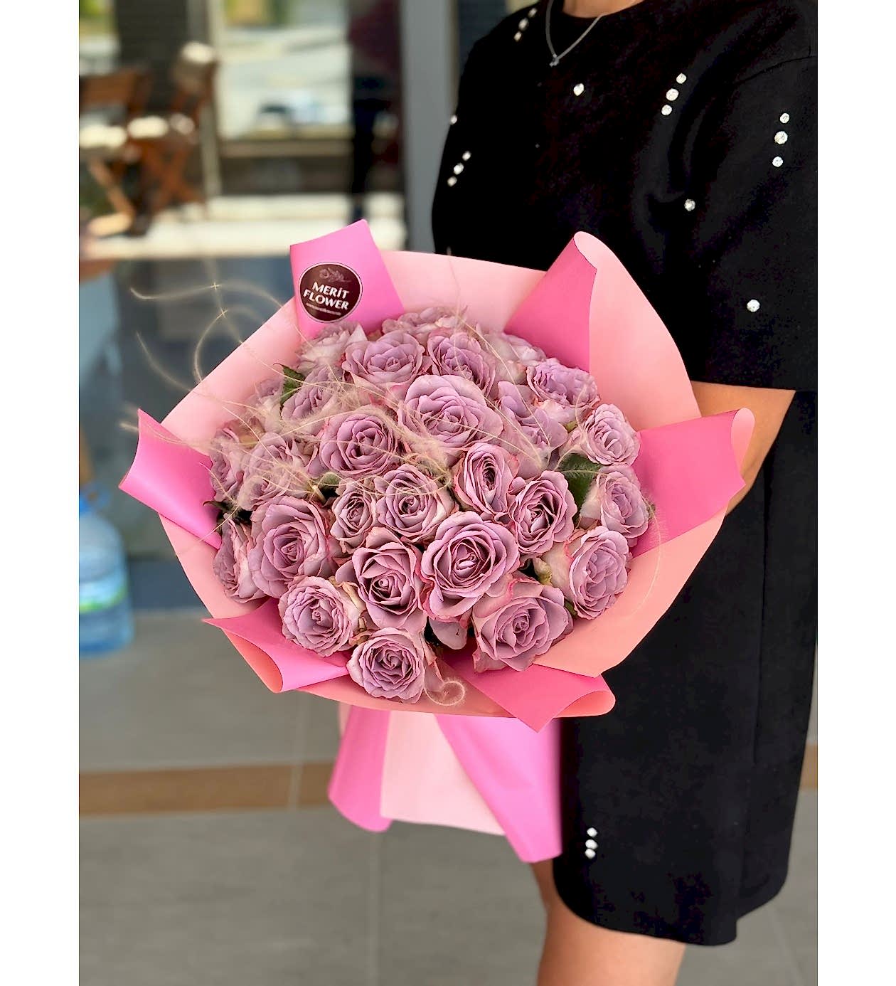 Premium kalite lila güller, pembe tonlu şık paketleme ile bir araya gelerek göz alıcı bir uyum oluşturur. Yoğun gül dokusu ve zarif formu sayesinde ilk bakışta etkileyici bir görünüm sunar.